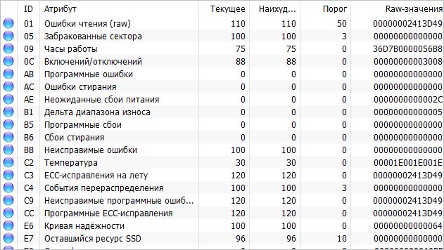 - Показатель RAW – состояние атрибута сейчас в шестнадцатеричном счислении.