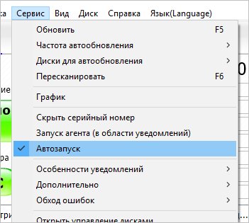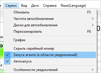 Способ всегда контролировать состояние носителя — добавить к Кристалл ДискИнфо автозапуск Windows. Для этого необходимо открыть программу, выбрать «Сервис – Автозапуск». Чтобы ПО не мешало при запуске системы, отметьте «Запуск агента» через область уведомлений.